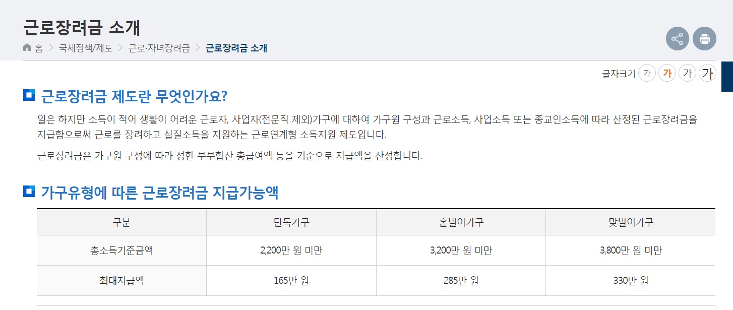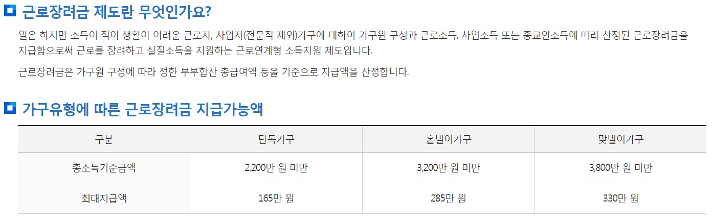 재산과 소득이 일정 금액 미만 근로자 사회인 사업자들의 근로를 장려하기위해 소득을 지원하는 제도입니다