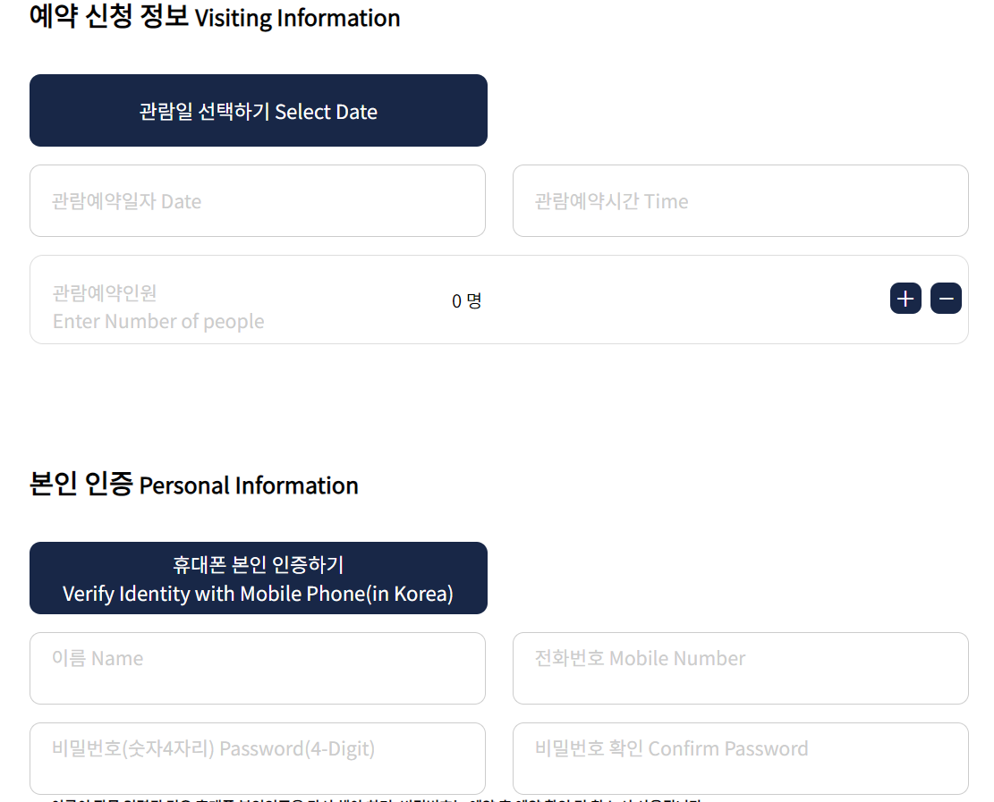 - 성명 연락처 , 관람일자, 관람인원 기입 후 약관 동의 후예약