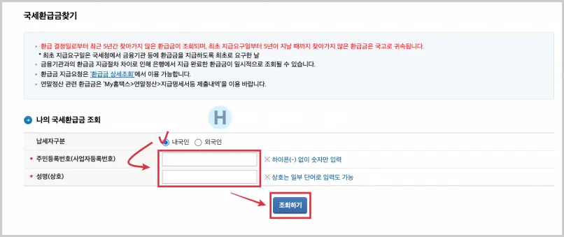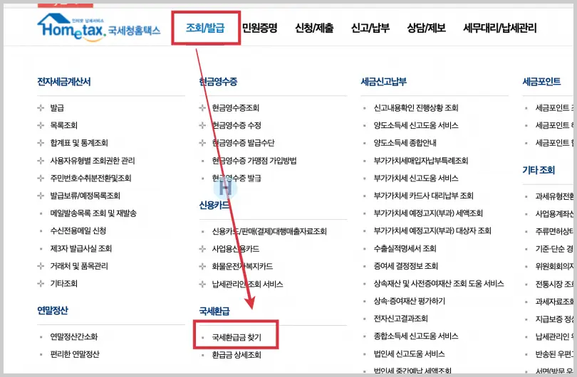 먼저 홈텍스 로그인 > 상단.조회발급>국세환급금 찾기 순으로