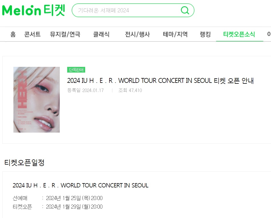 이번 아이유의 2024 월드투어 콘서트는 멜론에서 단독으로 진행되며 선예매 먼저 진행되고 이후 일반예매로 이루어 질것으로 예상됩니다.