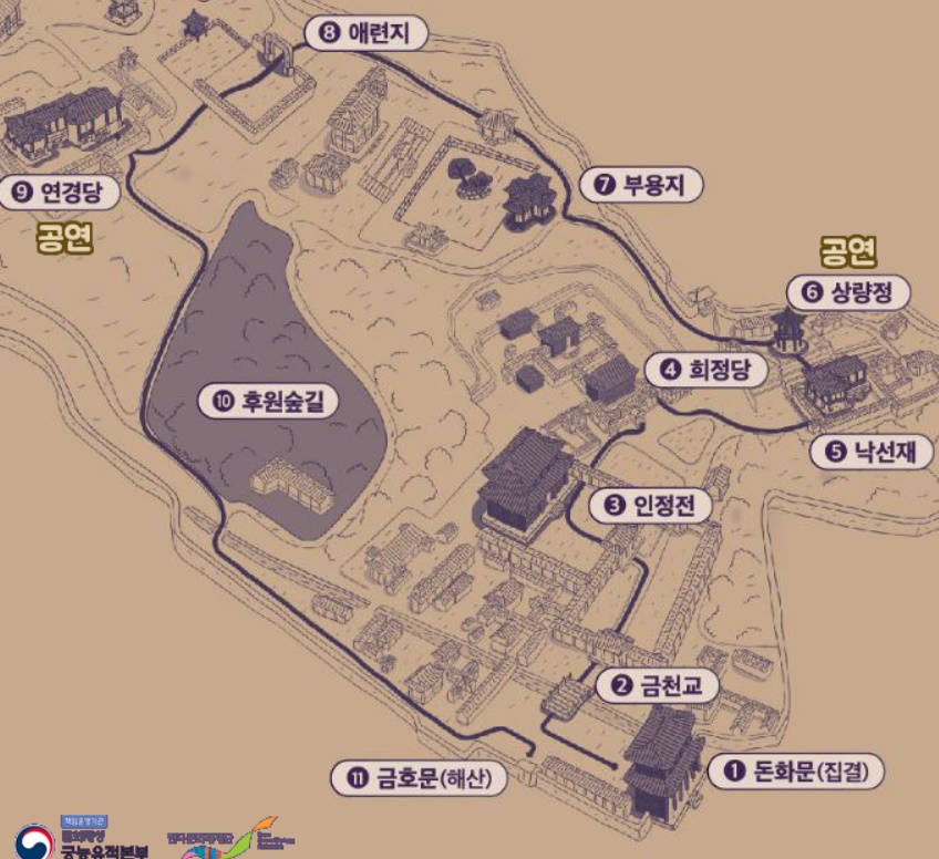 - 돈화문 → 진선문 → 인정전→ 희정당 →낙선재 →상량전 →부용지 →애련정관 → 연경당 → 후원숲길 →금호문